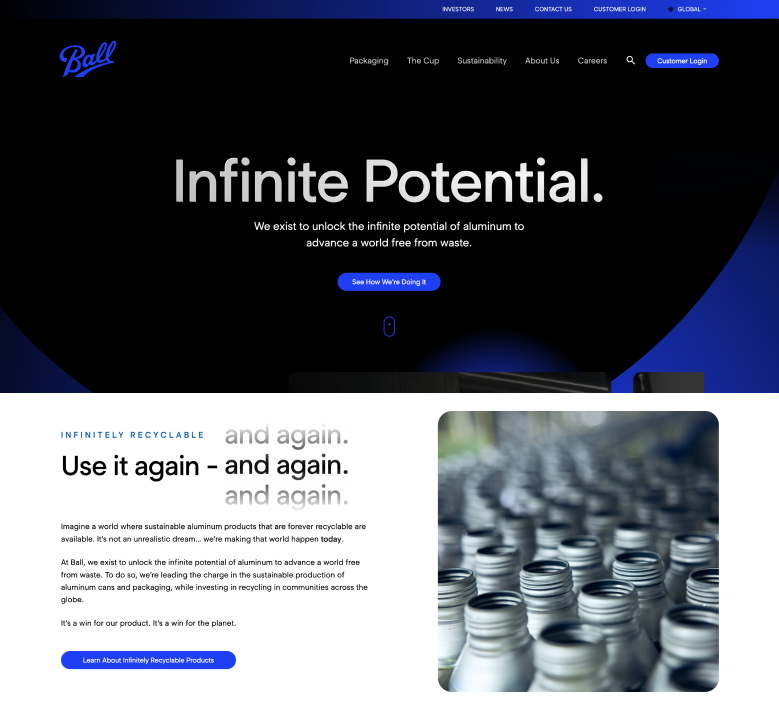 Ball Corp. comes in at #20 in Barron’s most sustainable companies of 2025 and boy does it show. They’re a B2B business with high brand name recognition due to their heritage, and are another stellar example of taking a truly brand-centric approach to communicating their initiatives – embedding them in every touchpoint.